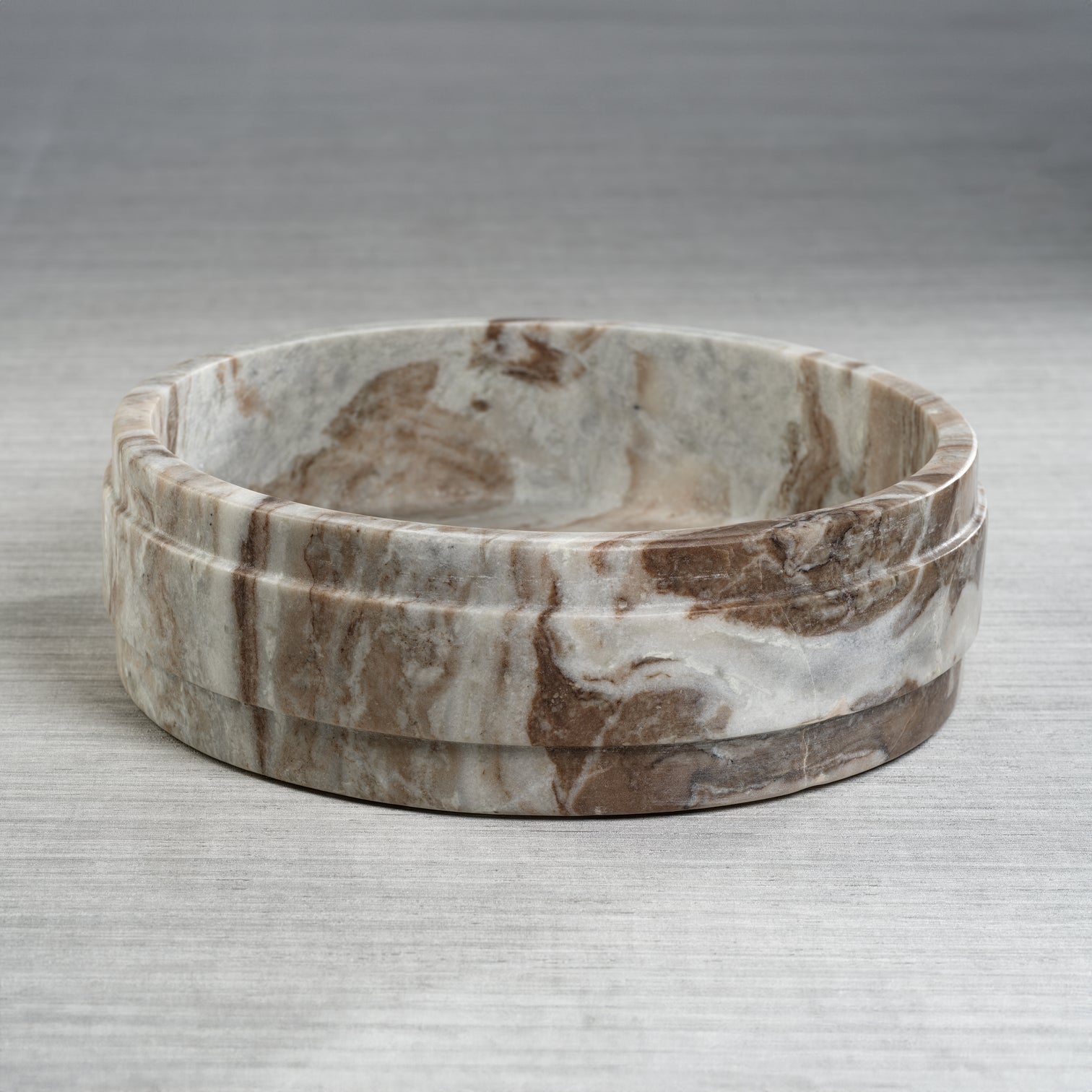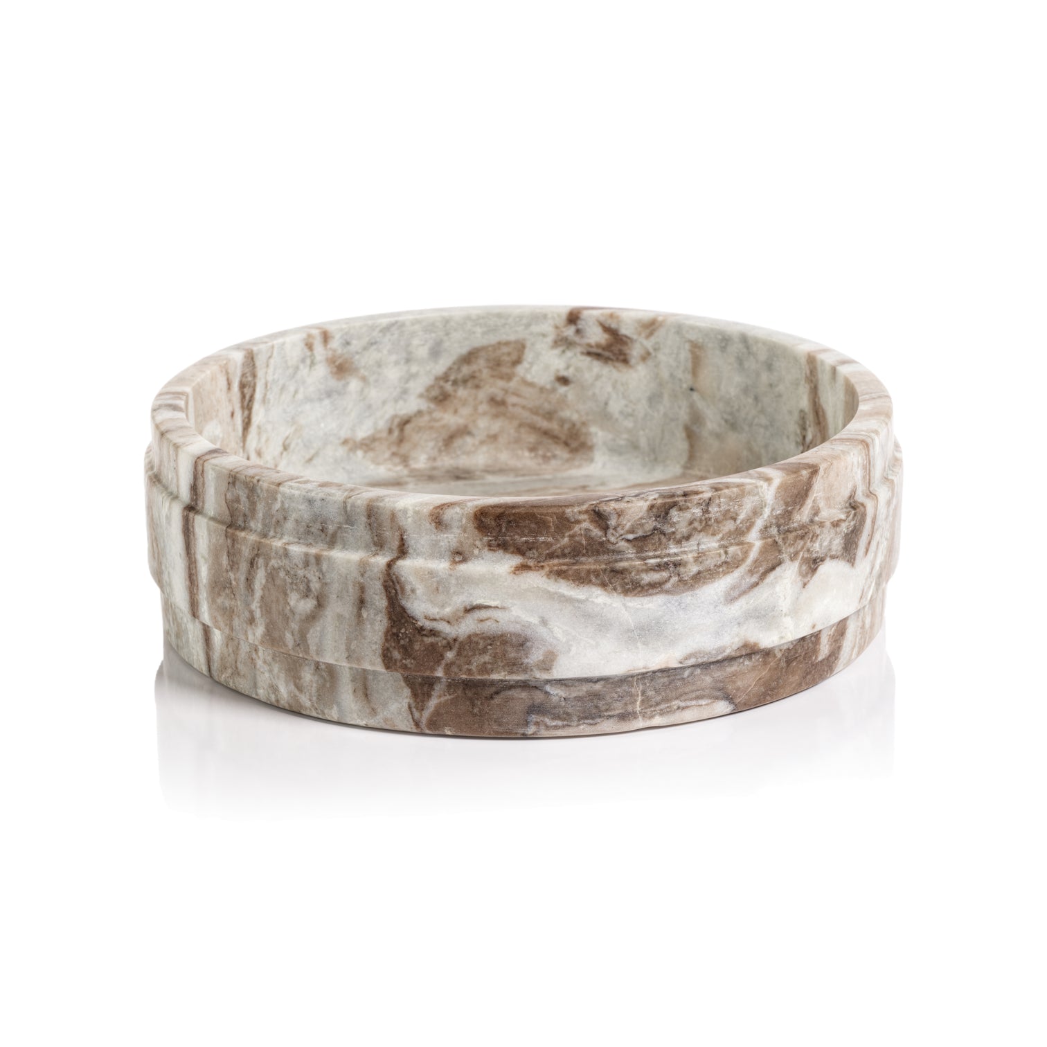 Timeless and sculptural, the Arabescato Marble Bowl showcases the natural beauty of richly veined marble in warm ivory and soft caramel tones. Its substantial silhouette and smooth, honed finish highlight the organic movement within the stone, making each piece uniquely one of a kind. Perfect as a centerpiece, catchall, or decorative accent, it brings quiet luxury and refined texture to any space.
