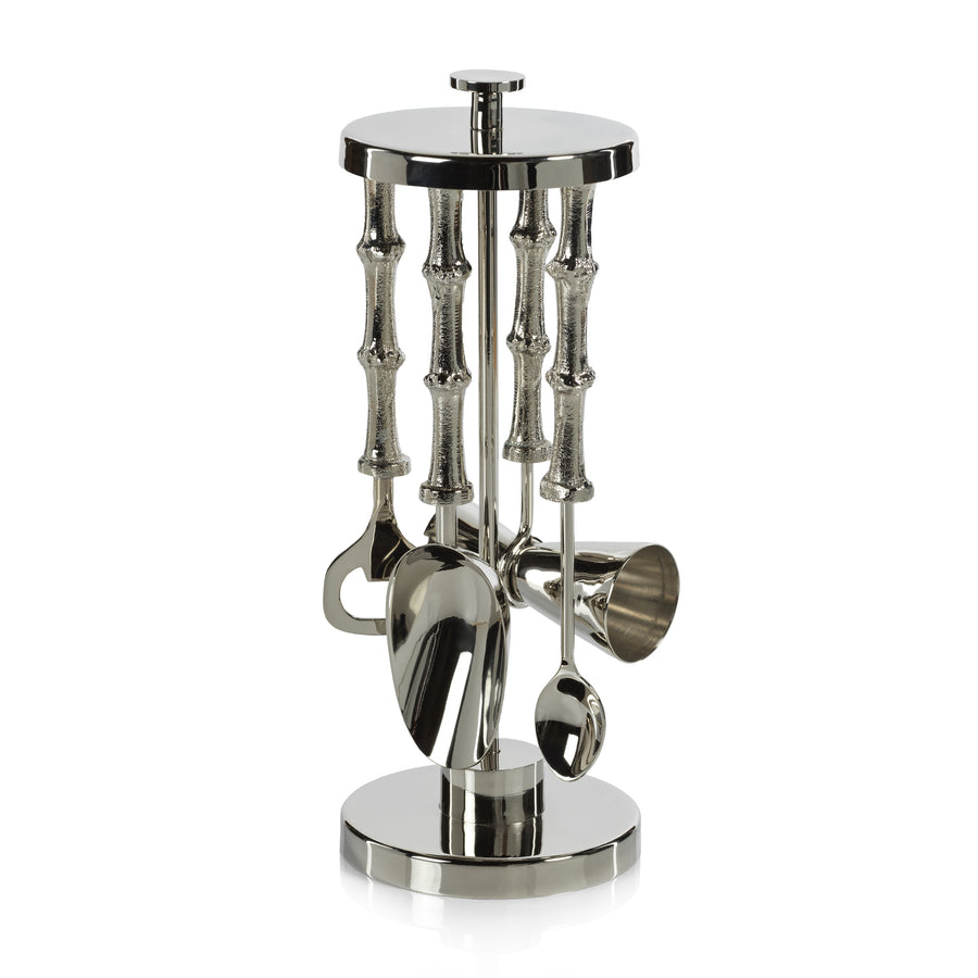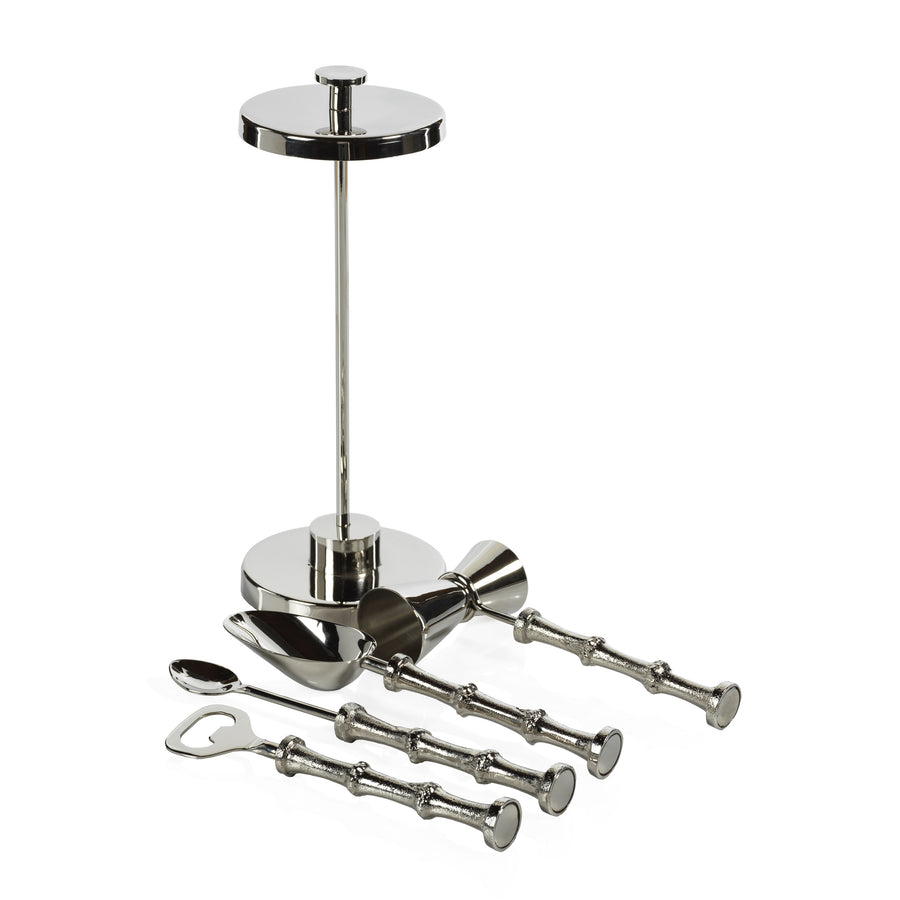 - Set Includes: Bottle Opener, Jigger, Ice Scoop, Spoon & Stand