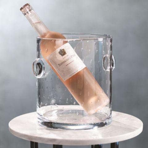 Playful yet polished, the Lagoon Ice Bucket features a clean cylindrical silhouette accented with delicate suspended bubbles throughout the glass. The integrated side handles add both function and sculptural detail, while the thick base gives it a substantial, elevated feel. Perfect for chilling wine or champagne, it brings texture, light, and effortless sophistication to any bar cart or tablescape.