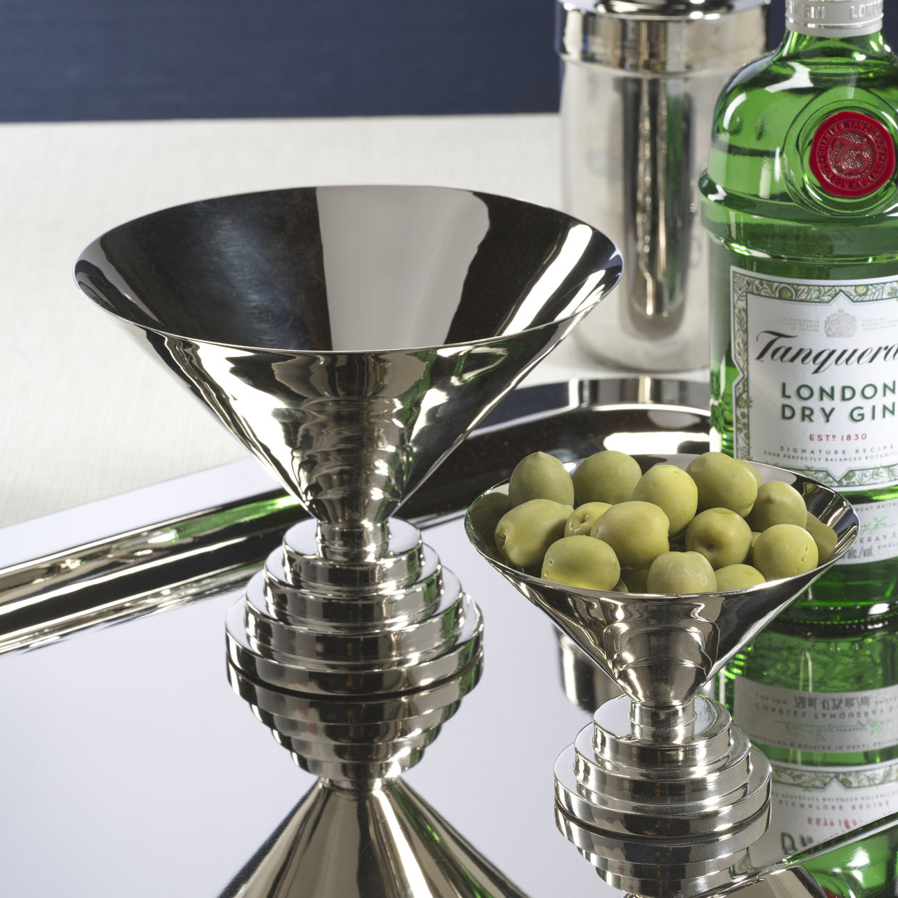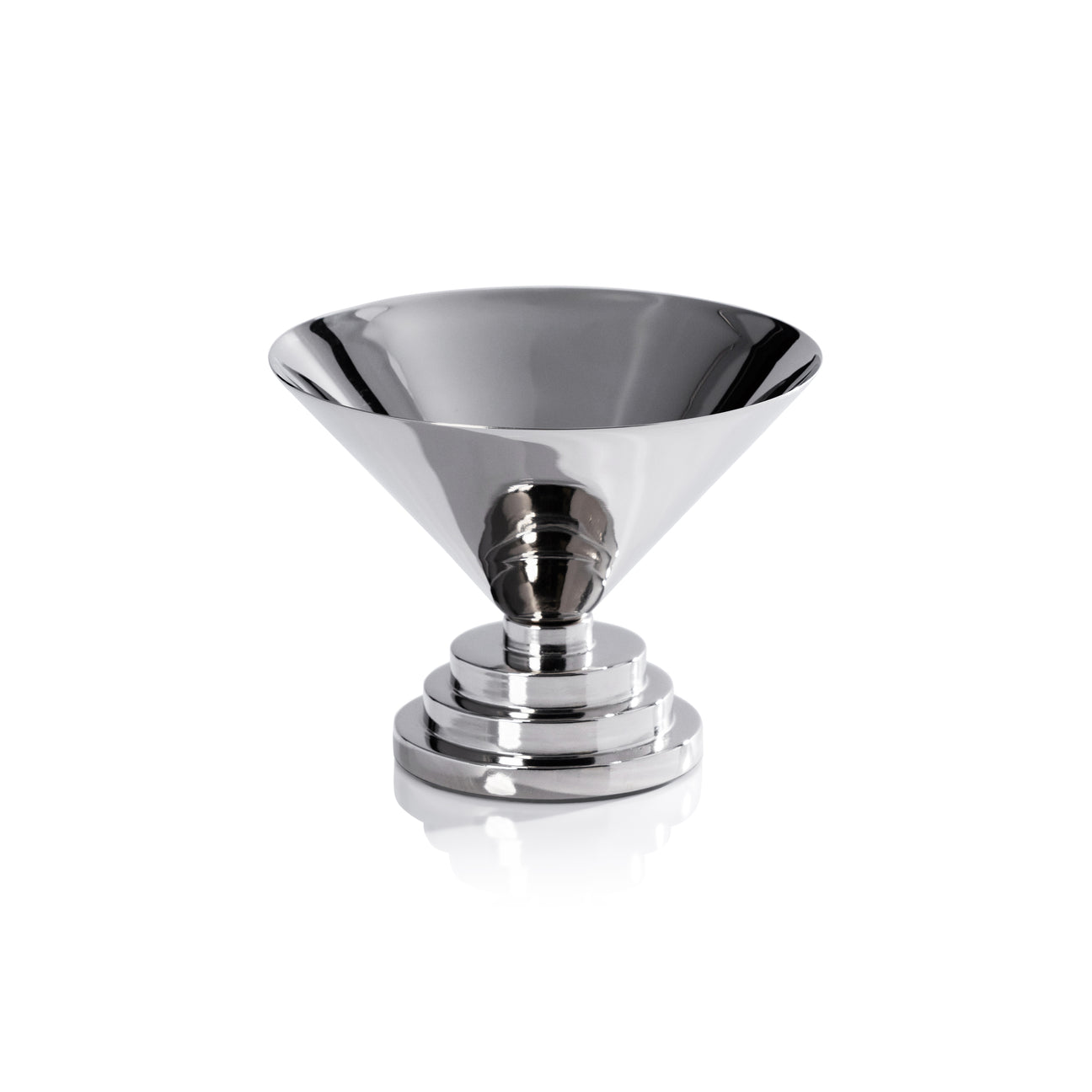 Sleek and sculptural, the Mayan Metal Bowl in polished nickel brings bold, Art Deco–inspired elegance to your bar or tabletop. Its flared silhouette and tiered pedestal base create a striking statement, while the high-shine finish reflects light beautifully. Perfect for serving olives, nuts, or cocktail garnishes, or styled solo as a modern accent piece.