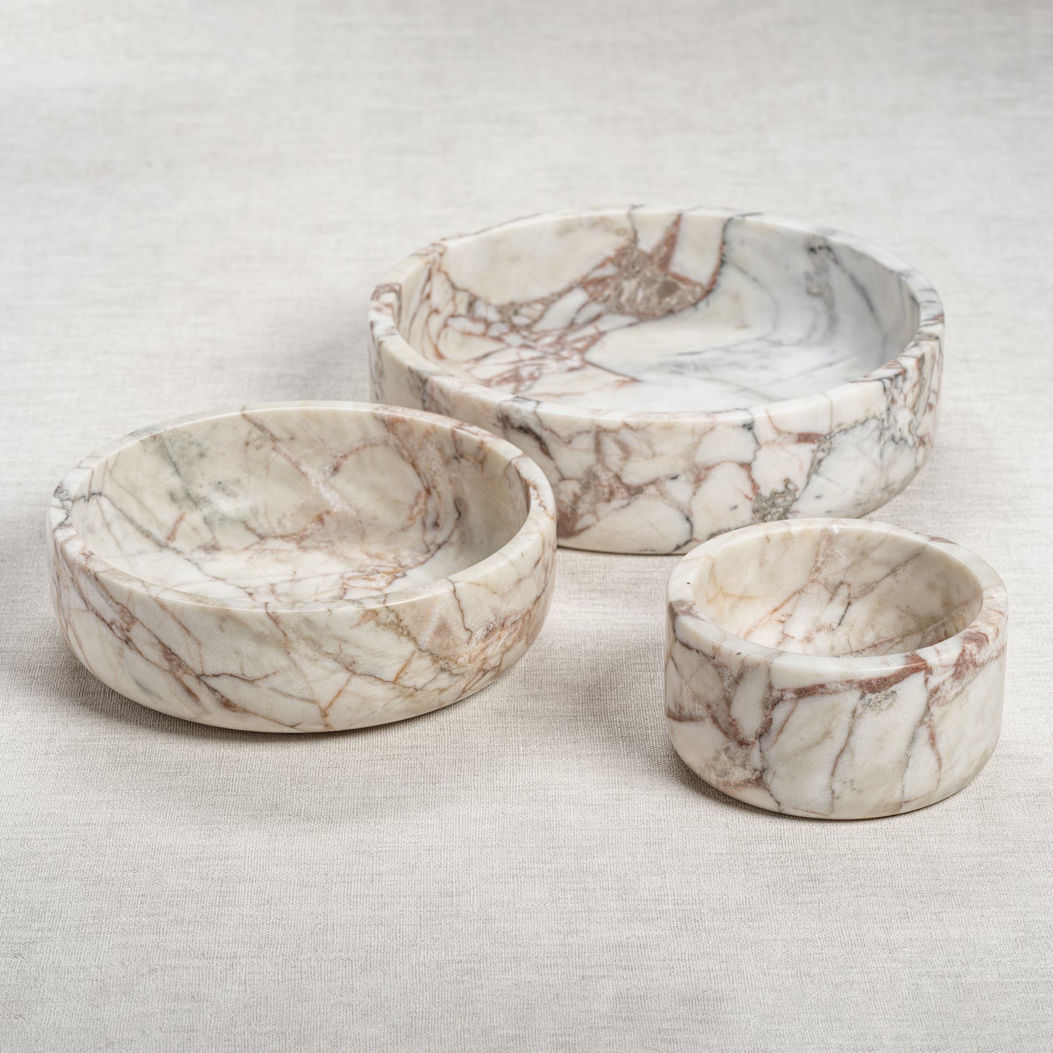 These are beautifully crafted marble bowls with intricate natural veining in shades of white, cream, and brown. The design emphasizes their raw, earthy aesthetic, perfect for decorative or functional use. The varying sizes allow for different purposes, from holding small items to being used as serving dishes or centerpieces.